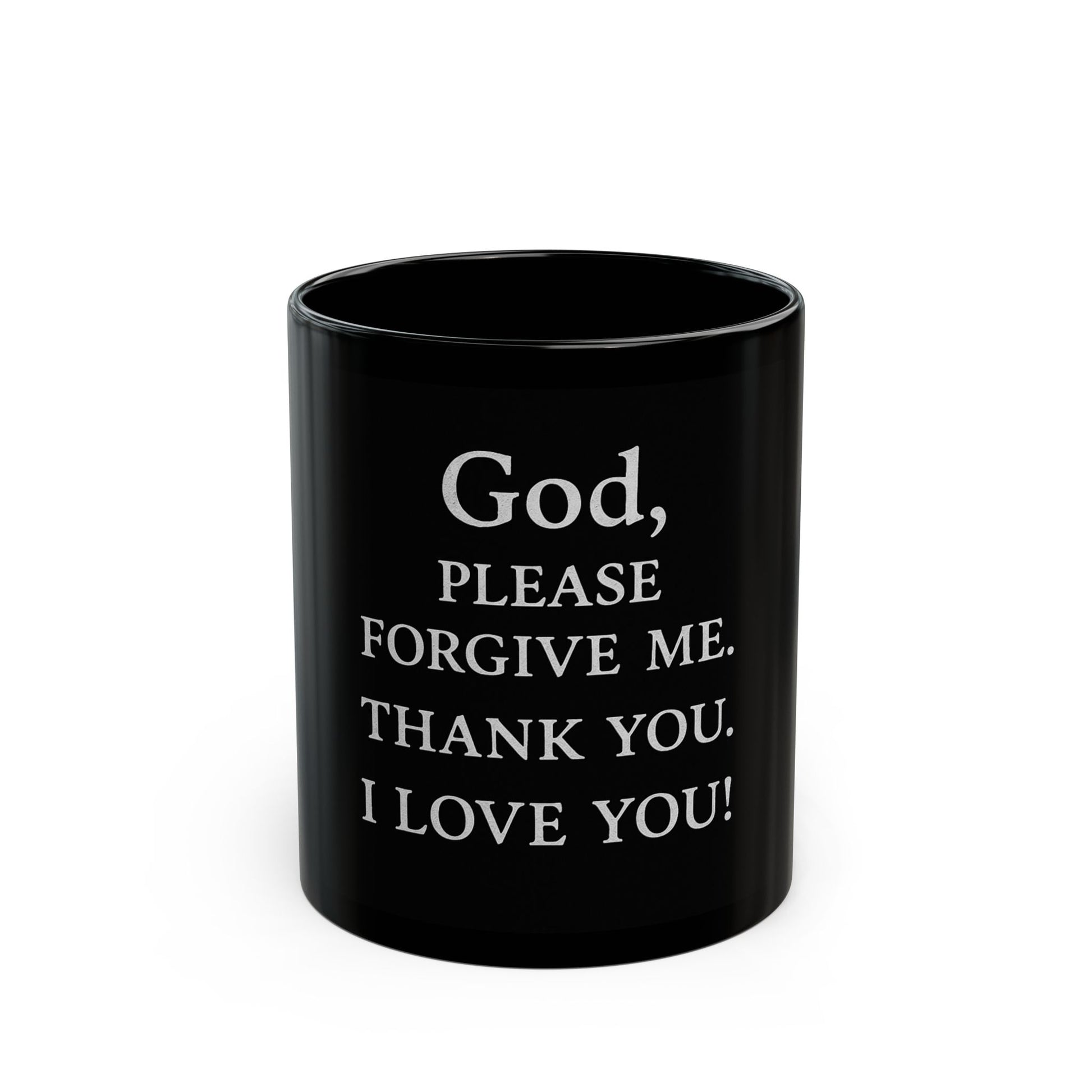 A black spiritual mug asking god for forgiveness, saying thank you, and I love you. This mug provides a sense of peace and gratitude, perfect for morning coffee or tea rituals. Ideal for adults looking to start their day on a positive note or seeking solace in their daily routine. Relevant for religious holidays, personal reflections, or daily reminders of gratitude.
